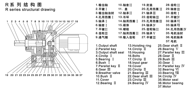 3、R系列斜齒輪硬齒面減速機選用優質鍛鋼材料,鋼性鑄鐵箱體,齒輪表面經過*頻熱處理;" />